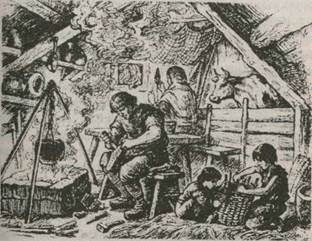 Рис.4. В крестьянской избе. Условиями перемирия, заключенного в Запольском Яме, и результатами Ливонской войны были недовольны обе стороны: Московское государство и Речь Посполитая. Потеря Русью морского побережья и Ливонии сильно сократила внешнюю торговлю страны. Беспрерывные войны привели к опустошению государственной казны. Экономическая и хозяйственная нестабильность сопровождалась значительным изменением социальной стратификации: крупные земельные собственники, мелкопоместные дворяне, военно-служилое сословие, крестьяне, посадское население городов теряли свое место в сословной горизонтали. Знать разорялась и переселялась на другие места, мелкопоместные и служилые люди приобретали или теряли земельные наделы, крупные и мелкие собственники переманивали крестьян на свои земли, посадские ремесленники выживались из городов засилием войсковых частей, которые задерживались надолго на постое. В этой ситуации в обществе оказалось большое количество недовольных, "лишних", обездоленных людей: они искали себе кров, защиту, возможность применения своих сил. Наиболее распространенным способом выжить был побег за пределы Русского государства в казацкие степи, на Волгу, Дон и т.д. Речь Посполитая, недовольная условиями перемирия, готовилась к войне. Король Стефан Баторий и поддерживающая его шляхетская группировка (партия) Яна Замойского строили обширные планы нанесения последнего удара. Финансовую помощь получил Стефан Баторий от Папы Римского Сикста: большую по тем временам сумму - 250 тыс. скудо. Посредником в этом деле являлся Антоний Поссевино, иезуитский священник и духовник старой жены Батория Анны Ягеллонки. Планы военной и католической экспансии совпали и поддерживали друг друга. Против тяжелой, разорительной войны в самой польской короне выступала магнатская группировка Зборовского. Аргументом в спорах часто выступала сабля, дело иногда доходило до кровопролитных стычек. В самый разгар приготовлений к войне (1586 г) король умер. По традиции, шляхта Речи Посполитой имела право на выдвижение и избрание нового короля. В предвыборную борьбу, кроме группировок Замойского и Зборовского, включилась Литовская партия. Зборовские предлагали избрать брата немецкого императора Рудольфа - эрцгерцога Максимилиана, Замойские - шведского королевича Сигизмунда, Литовская партия - московского царя Федора Ивановича. Победили, захватив в плен и разбив военный отряд Максимилиана, Замойские. Сигизмунд короновался в Кракове. После смерти царя Ивана Грозного московский престол занял его сын Федор, тот самый Федор Иоаннович, которого выдвигала кандидатом на трон Речи Посполитой Литовская партия. Последний отпрыск царского рода Рюриковичей остался в памяти современников "смиренно-блаженным" правителем в отличие от своего "Грозного" отца. "Временник дьяка Тимофеева" характеризует Федора как "естеством кроткого и... в милостях ко всем", "непорочного", любящего более всего "благочестие и благолепие церковное". По описаниям, "внешне он выглядел так: двадцати семи лет, небольшого роста, приземистый и опухший, с ястребиным носом, нетвердой походкой и постоянной улыбкой на устах". Он был совершенно неспособен к самостоятельному ведению государственных дел. Главную роль в управлении делами стал играть приближенный царя Борис Федорови