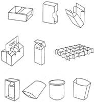 Рис. 1.6 Канистры Остальные конструкции являются представителями транспортной тары. Ящики характеризуются корпусом, имеющим в сечении, параллельном дну, преимущественно форму прямоугольника. В состав ящика входят дно, две пары торцевых и боковых стенок. Ящики бывают с крышкой и без нее. Флягами называют транспортную тару с корпусом цилиндрической формы, переходящим в узкую горловину. Фляги снабжены устройством для переноса, крышкой, имеющей рычажный или винтовой затвор. Бочки представляют собой транспортную тару с корпусом цилиндрической или параболической формы. На корпусе предусмотрены обручи или зиги (гофры) для катания. Днища снабжены сливными отверстиями либо одно дно выполняется съёмным. Барабаны имеют гладкий или гофрированный корпус цилиндрической или конической формы без обручей или зигов для катания, с плоским дном и крышкой. Мешки относят к транспортной мягкой таре. Они имеют корпус в форме рукава, дно и горловину. Горловина бывает открытой или закрытой клапаном. По технологии производства тару и упаковку классифицируют в первую очередь во взаимосвязи с ее материалом и с конструктивными особенностями. Наибольшее количество материалов и методов их переработки встречается в производстве полимерной тары и упаковки. Для полимеров принципиально важна взаимосвязь общего процесса получения материала и процесса придания этому материалу требуемой формы, иначе говоря - получение изделия. Конечным критерием правильности выбора технологического процесса и параметров его проведения является высокое качество именно изделия. Технологическая последовательность по схеме полимер - материал - метод формования - изделие имеет и обратную связь, позволяющую определить правильность выбора каждой стадии по уровню достигнутого качества изделия. 1.3 Классификация по каталогу ECMA В Европе производимые коробки объединены в несколько каталогов, в зависимости от материала – ECMA и FEFCO. Объединяющая специалистов ведущих стран Европейская ассоциация производителей картонной упаковки (ЕСМА) в 1967 г. выпустила первый сборник стандартных конструкций складных коробок. В то время в конструкциях преобладала продольная склейка швов. В последующее время появилось новое поколение оборудования, материалов, получило дальнейшее развитие, создание новых конструкций складных коробок, разработана система компьютерного конструирования коробок (CAD). На базе этой системы и сборника стандартов Европейского центра стандартизации (CEN) в 1992 г. ЕСМА разработала новый каталог стандартных конструкций складных коробок. Группу А составили прямоугольные картонные коробки, имеющие по высоте Н продольный клеевой шов. Все наружные плоскости таких коробок расположены под прямыми углами друг к другу. В группу В вошли прямоугольные коробки без продольных клеевых швов. Соединение их сторон осуществляется с помощью затворов разнообразных конструкций. Группу С образовали непрямоугольные картонные коробки с продольным швом на высоте Н. Несколько внешних сторон коробок имеют различную непрямоугольную форму и могут быть расположены под углом к основанию. Группа D состоит из непрямоугольных коробок без продольных клеевых швов. Соединение их сторон выполняется различными затворами. Группа Е включает конструкции коробок, находящихся в непосредственном к