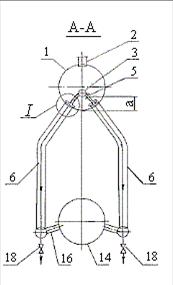 Рис. 1.3.5 Рис. 1.3.6 Расстояние (а) от отверстий 8 до стенки верхнего барабана 1 должно быть не менее 200 - 250 мм. Количество отверстий 8 в продольном патрубке 3 в зависимости от теплопроизводительности котла должно составлять при: 2.5 Гкал/ч - 30 шт. 4.0 Гкал/ч - 50 шт. 6.5 Гкал/ч - 75 шт. 10.0 Гкал/ч - 100 шт. Подвод сетевой воды в продольный патрубок 3 производить одним патрубком II диаметром 108 - 219 мм (или двумя патрубками диаметром 108 - 133 мм). Второй поток, составляющий 40 % от общего расхода воды через котел - через патрубок 12 - с донышком 13 диаметром 108 - 133 мм установленный внутри нижнего барабана 14. На концевом участке патрубка 12 (рис. 1.3.6) должны быть сопла 15 диаметром (Д1) от 32 до 57 мм соответственно диаметру (Д2) перепускных труб 16 между нижним барабанам и всеми коллекторами 17 топочных экранов. Выходные сечения сопел 15 устанавливаются заподлицо с входными сечениями перепускных труб 16 и сетевая вода направляется непосредственно в эти перепускные трубы 16. При этом котловая вода из нижнего барабана 14 эжектируется в перепускные трубы 16, обеспечивая подогрев сетевой воды. Продольный патрубок 3 в верхнем барабане 1 должен иметь опоры, выполненные из уголка или прутка, приваренного к продольному патрубку 3 и свободно опирающегося на боковые стенки верхнего барабана 1. Сепарационные устройства в верхнем барабане 1 могут быть демонтированы при окончательном переводе котла на водогрейный режим работы. Схема включения котлов в тепловую схему котельной представлена на рис 1.3.7.