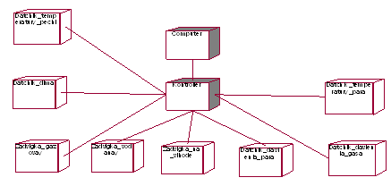 Рис. 4.1.1 Диаграмма топологии Центральным устройством системы управления, функционально связанным со всеми устройствами системы и управляющий ими, является контроллер, что соответствует определенным выше требованиям к системе. Далее определяем, каким образом устройства, показанные на диаграмме топологии, взаимодействуют между собой. Для этого сначала разделим устройства в зависимости от выполняемых ими функций на следующие категории (классы): × Контроллер (класс Controller) – посылает запросы датчикам и управляющих сигналов исполняющим устройствам. × Задвижки (класс Zadvigka) - открытие и закрытие. × Датчик давления (класс Datchik_davlenia) – измерение давления. × Датчик температуры (класс Datchik_temperatury) - измерение температуры. × Датчик дыма (класс Datchik_dima) - измерение задымленности. После декомпозиции системы (разбиения на классы), представим ее как совокупность взаимодействующих объектов соответствующих классов. На данной диаграмме приняты следующие обозначения: Datchik_temperatury_pechi – датчик температуры печи; Datchik_temperatury_para – датчик температуры пара; Datchik_dima - датчик дыма; Datchik_davlenia_para – датчик давления пара; Datchik_davlenia_gasa – датчик давления газа; Zadvigka_na_vihode – задвижка на выходе; Zadvigka_vodanay – задвижка на воду; Zadvigka_gazovay – задвижка на газ; Легко заметить, почти все объекты, представленные на диаграмме, соответствуют устройствам на диаграмме топологии. На диаграмме видно, что всем объектам класса Zadvigka контроллером посылаются управляющие сигналы на занятие определенного положения (Pologenie) соответствующей задвижкой. Датчикам Datchik_davlenia, Datchik_temperatury, Datchik_dima контроллер посылает запросы на выдачу соответственно значения температуры, давления и наличия дыма (Schitat_informaciu). После того, как были определена принадлежность объектов тем или иным классам, детализируем каждый класс с целью определения свойств объектов системы. Класс Zadvigka Так как клапаны должны выполнять только функции открытия и закрытия, класс не содержит атрибутов, а содержит только два метода: Pologenie() и Zakrit(). Класс Datchik_temperatury Класс Datchik_davlenia Класс Datchik_dima Класс Controller Должен содержать в себе все введенные оператором параметры технологического процесса: Schitat_informaciu – считывание информации с датчиков. Stop – остановка работы системы. Izmenit_parametr – изменение параметров работы системы . Класс Computer Prinat_informaciu – принимает информацию с датчиков и контроллера. Stop – сигнал на остановку системы. Izmenit_parametr – сигнал на изменение параметров. Все выше сказанное представлено на диаграмме классов рис. 4.1.3
