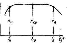 Рис.1.3 Частотна характеристика підсилювача Оцінку внесених підсилювачем частотних спотворень роблять по його частотній характеристиці (називаною також амплітудно-частотною характеристикою), що представляє собою графік залежності модуля коефіцієнта підсилення До від частоти (мал.1.3), де по вертикальній осі відкладають К в лінійному або логарифмічному масштабі (або вихідна напруга Uвих, що відповідає незмінному значенню вхідної напруги Uвх) і по горизонтальній осі - частоту f у герцах (або кутову частоту ω=2πf) у логарифмічному масштабі. Необхідність застосування логарифмічного масштабу на осі частот диктується широким діапазоном робочих частот сучасних підсилювачів. Діапазоном робочих частот підсилювача гармонійних сигналів називають смугу частот від нижчої робочої частоти fн до вищої робочої частоти fв, у межах якої абсолютна величина (модуль) коефіцієнта підсилення, а іноді і його фаза не повинні виходити за межі заданих допусків. Діапазон робочих частот, а отже, і частоти fн і fв визначаються призначенням підсилювача; їх вибирають у відповідності зі спектральним складом посилюваних сигналів. Амплітудна характеристика і динамічний діапазон. Амплітудною характеристикою підсилювача називають залежність амплітуди (або діючого значення) напруги сигналу на виході, від амплітуди (або діючого значення) напруги сигналу на вході. Тому що коефіцієнт підсилення ідеального підсилювача надає собою постійну величину, що не залежить від величини вхідного сигналу, його амплітудна характеристика являє собою пряму. минаючу через початок координат; під кутом, обумовленим посиленням підсилювача (мал.1.4, пунктир).