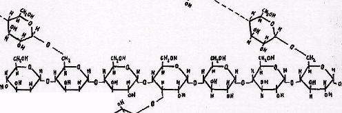К главной цепи глюкозных остатков (около 100) присоединяются многочисленные ветви из 20 глюкозных остатков. Присоединение может происходить за счет гидрооксилов как шестого, так в третьего (главной цепи). Боковые ветви в свою очередь могут ветвиться, и в этом случае ветвление уже не будет таким регулярным, как предполагает ламинарная схема. Работы Хеуорта и других, посвященные вопросам строения крахмала послужили отправным пунктом целой серии работ К. Мейера и его сотрудников. Нужно напомнить, что прямые указания на то, что крахмальное зерно содержит по меньшей мере два полисахарида, игнорировались исследователями очень долго, и хотя уже к 40 гг. текущего столетия накопился большой материал, касающийся свойств обоих полимеров, все предыдущие работы по строению относились к крахмалу вообще. К. Мейеру принадлежит заслуга начала изучения строения не крахмала в целом, а его компонентов. Первоначально к признанию двухкомпонентности крахмала и различного строения компонентов Мейер и Марк пришли изучая растворы крахмала при помощи вискозиметрии. Дальнейшие исследования маисового крахмала показали, что при нагревании крахмального клейстера в раствор переходит лишь некоторая часть вещества, в молекуле которого можно было определить единственную конечную нередуцирующую группу: если исходный крахмал давал 3,5% тетраметилглюкозы, то извлекаемая водой часть давала только 0,31% ее при среднем молекулярном весе около 50.000 (по осмотическому давлению ее триацетата с молекулярным весом около 80.000). Оставшаяся нерастворенной часть крахмала давала больший % тефраметилглюкозы, чем исходный крахмал - 3,7% и имела больший молекулярный вес (несколько сот тысяч). В этой же работе Мейер определяет и среднее число точек ветвления этой части крахмала - около 100. Детальное изучение фракций крахмала дало Мейеру также право с уверенностью говорить о конституционных отличиях обоих фракций и выразить свои взгляды на эти фракции, названные им "амилозой" и "амилопектином" в следующих положениях. "Амилоза" - компонент крахмала, состоящий из большого числа глюкозных остатков, связанных α-1,4-глюкозидной связью в неразветвленную цепь. Эта цепь обладает одной конечной нередуцирующей группой (обнаруживается как 2,3,4,6-тетраметилглюкоза при гидролизе метилированной амилозы) и одной потенциальной альдегидной группой. Амилоза при растворении в воде не образует клейстера, но быстро выпадает в осадок (ретроградация). При этом скорость выпадения зависит от молекулярного веса, увеличиваясь по мере увеличения последнего. Степень полимеризации амилозы колеблется от 10 000 до 100 000. Обладая только α - 1,4 - связями, амилоза полностью расщепляется ферментом - амилазой, гидролизующей эти связи.