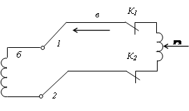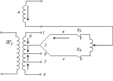 а – не регулируемая; б – регулируемая; в, г – подвижные контакты. На регулируемой обмотке б имеется ряд регулировочных ответвлений. Ответвление 1, 2 соответствует части обмотки, включенной согласно с основной, ответвления 3, 4 включены встречно. При включении 1, 2 коэффициент трансформации повышается, 3, 4 – уменьшается. Основной вывод обмотки точка 0. На регулируемой части обмотки включено переключающее устройство, которое состоит из в, г – подвижные контакты, К1, К2 – контакторы и Р – регулировочный токоограничивающий реактор Допустим, требуется переключить со второго на первое ответвление. Отключаем контактор К 1 переводим подвижный контакт в на регулировочное ответвление 1, включаем контактор К1. С помощью трансформатора с РПН переключая регулировочные обмотки, выполняем требование встречного регулирования.