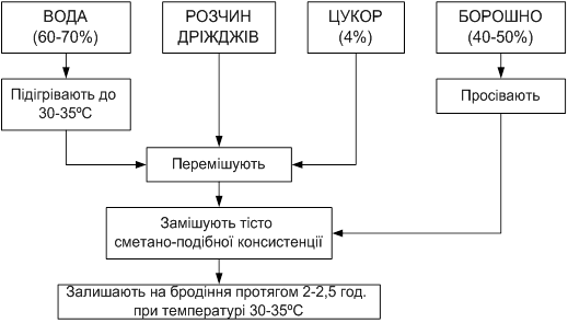 Рис.2.2 – Технологічна схема приготування опарного тіста У разі приготування тіста без виздоби при його замішуванні на опарі спочатку вносять сіль, цукор, розтоплений жир, все перемішують, потім додають борошно і суспензію дріжджів. Якщо дозволяє вологість виробів, цукор попередньо розводять у невеликій кількості води і перемішують з розтопленим маслом. Тісто виброджує 1,5-2 год. Якщо ж тісто готують з виздобою, тоді при його замішуванні добавляють розчин солі, решту води і більшу частину борошна, передбаченого на заміс тіста. Решту борошна вносять під час виздоби. Замішене таким чином тісто бродить від 40 до 60 хв. Після цього проводять його виздобу. Під час виздоби у тісто додають цукор, жир, родзинки, ванілін, іншу сировину, все перемішують і вносять борошно, що залишилось, та решту пресованих дріжджів (25-30%). Орієнтовно під час виздоби тіста вносять борошна: на 1 кг цукру – 0,7 кг; на 1 кг жиру – 1 кг; на 1 кг яєць – 1,4 кг. Тісто після виздоби виброджує 60-90 хв. У період від замішування до виздоби тісто інтенсивно виброджує, що сприяє покращанню стану м'якушки і смакових якостей виробів. Безопарний спосіб приготування тіста У разі безопарного способу приготування тісто замішують із всієї кількості борошна, води, солі, дріжджів і додаткової сировини. Початкова температура тіста 29-31°С, тривалість бродіння складає від 150 до 180 хв. Через 50-60 хв. після замішування рекомендується тісто обім'яти. Обминання доцільно зробити двічі (друге – за 20-30 хв. до розробки тіста). Для покращання якості виробів, особливо стану м'якушки, безопарний спосіб доцільно поєднувати з активацією дріжджів. Фазу активації готують із 30 кг борошна, 25 л води, 1-1,5 кг цукру і всієї кількості дріжджів. Тривалість активації складає від 40 до 90 хв. при температурі 29-30°С. На активованих таким способом дріжджах замішують тісто. Температура тіста має бути 30-31°С, тривалість бродіння 2-2,5 год. На виробництві цю фазу іноді називають «бовтанкою». Прискорені способи приготування тіста для здобних виробів передбачають використання різних технологічних заходів і харчових добавок, що інтенсифікують мікробіологічні, колоїдні та біохімічні процеси в тісті. З цією метою збільшують дозування пресованих дріжджів, використовують високоактивні або інстантні дріжджі, що мають підвищену бродильну активність, застосовують швидкісний або подовжений заміс тіста, підвищують температуру бродіння опари і а на 1-2°С, додають у тісто концентровану молочнокислу закваску у кількості 3-5 %.