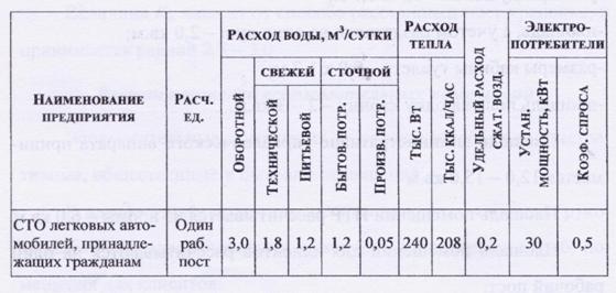 3.2 Расчет потребности основных видов ресурсов для технологических нужд СТО Удельные нормы расхода воды, тепла, сжатого воздуха и установленной мощности принимается по таблице: Табл. 7. Нормы расхода воды