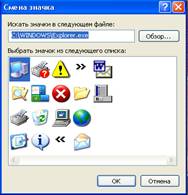 Рис. 22. Диалоговое окно Элементы рабочего стола; диалоговое окно Смена значка Специфика фоновых рисунков состоит в том, что они занимают память компьютера. Если в качестве фона используется очень сложный многоцветный рисунок, то он может занять значительную долю ресурсов компьютера и существенно замедлить его работу. Значки на рабочем столе можно настроить с использованием диалогового окна Элементы рабочего стола. Данное окно позволяет скрыть или показать стандартные значки, которые указаны в группе Значки рабочего стола, путем установки или снятия флажка, который соответствует тому или иному значку. Также в данном окне можно настроить вид стандартных значков, для чего необходимо выделить значок и нажать на кнопку Сменить значок… В результате описанных выше действий будет открыто окно Смена значка. Далее необходимо выбрать подходящий значок и нажать на кнопку ОК. Наряду с этим, диалоговое окно Элементы рабочего стола содержит очень полезный сервис – Очистка рабочего стола. Во время работы пользователь, для удобства, помещает на рабочий стол различные ярлыки, позволяющие быстро запускать программы или открывать документы. Со временем рабочий стол заполняется, и на нем появляются ненужные, старые ярлыки, которые мешают работе пользователя и, расходуя ресурсы системы, замедляют работу компьютера. Для удаления таких ненужных ярлыков в системе Windows имеется специальный мастер, который можно вызвать, нажав на кнопку Очистить рабочий стол. Данный мастер выводит список всех ярлыков, которые расположены на рабочем столе, а также дату последнего использования. Пользователь может отметить ненужные ярлыки и удалить их с рабочего стола. По окончании установки фона и настройки рабочего стола можно нажать кнопку ОК и завершить настройку или ввести изменения в силу с помощью кнопки Применить, а затем продолжить настройку на других вкладках. Выбор экранной заставки. Экранная заставка представляет собой какой-либо движущийся узор, который отображается на экране после того, как Windows «обнаруживает», что пользователь не касался клавиатуры или мыши в течение определенного промежутка времени. Выбор и установка параметров экранной заставки выполняется на вкладке Заставка. Тип заставки необходимо выбрать из списка с одноименным названием, а время (в минутах), через которое заставка будет включаться, устанавливается в поле Интервал. В верхней части окна располагается копия экрана, где отображается образец заставки. Можно просмотреть ее и в полноэкранном изображении – для этого служит кнопка Просмотр.