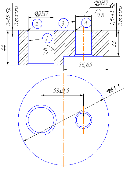 Рис. 1. Шайба ступінчаста. Ескіз Для подальших розрахунків призначимо наступні методи обробки: 1) обточування діаметру ñ 113,3 мм (токарна операція); 2) фрезерування пазу 56,65 мм (фрезерна операція); 3) свердління отворів 1 і 3 (див. рис. 1) – (свердлильна операція); 4) зенкування фасок 2 і 4 (свердлильна операція); 5) зенкерування отворів 1 і 3 (свердлильна операція); 6) розвертання отворів 1 і 3 (свердлильна операція). Для кожного виду обробки вибираємо різальні інструменти, керуючись рекомендаціями [1], виходячи із оброблюваного матеріалу та заданих початкових умов: – для обточування діаметруñ 113,3 – токарний прохідний різець ГОСТ 18878–73 з пластинами з твердого сплаву ВК6 [с. 120, 1]. – для фрезерування пазу 56,65 мм – фреза торцева насадна ø125 ГОСТ 9473–80, матеріал твердосплавних пластин – ВК6, кількість зубів z =12, ширина B = 42 мм [табл. 94, с. 187, 1]; геометричні параметри фрези за ГОСТ 9473–80; – для свердління отворів 1 і 3 – свердла ø18,5 і ø30 ГОСТ 10903–77 [табл. 42, с. 147, 1], матеріал – швидкорізальна сталь Р6М5; – для зенкування фасок 2 і 4 – конічна зенковка ø22, матеріал – швидкорізальна сталь Р6М5; – для зенкерування отворів 1 і 3 – зенкери ø19,9 і ø31,8 ГОСТ 12489–71, матеріал – швидкорізальна сталь Р6М5; – для розвертання отворів 1 і 3 – розвертки ø20 і ø33 ГОСТ 1672–80, матеріал – швидкорізальна сталь Р6М5. 2. Виконання ескізів