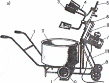 Рис.7 смеситель со сменными чашами общий вид и схема. Растворосмеситель с вертикальным лопастным валом рис.7 с объемом готового замеса 65 л имеет три основных узла: чащу-тачку I, представляющую собой цилиндрическую чашу 2, смонтированную на тачке 1, откидывающийся смеситель II. состоящий и3 вертикального лопастного вала 4, фланцевого электродвигателя 7 на напряжение 220/380 В, с частотой 50 гц, трехступенчатого цилиндрического редуктора б, неподвижной лопасти 3 и ограждения 5, тележку, имеющую обрезиненные колеса 8, фиксаторы-ловушки 9 для установки чаши-тачки 1 и шкаф электрооборудования. При вращении по часовой стрелке лопастного вала, смещенного относительно центра чаши, движущаяся смесь увлекает за собой чашу, вращающуюся вокруг своей оси против часовой стрелки в опоре 10. Частота вращения чаши регулируется отклонением не подвижной лопасти 3, шарнирно соединенной с корпусом редуктора привода. Эта лопасть создает нужное направление потоков смеси и способствует лучшему перемешиванию компонентов. Привод шарнирно подвешен к раме одноосной тележки II, что позволяет поднимать, лопастной вал по окончании цикла перемешивания и перемещать чашу с готовым замесом на тачке. При подъеме привода Он автоматически отключается. Рабочее положение лопастей фиксируется специальным упором. В комплект растворосмесителя входят две сменные чаши-тачки, которые попеременно используются в качестве барабана-смесителя и ёмкости готового раствора. на месте укладки. Техническая производительность смесителя 1,2.1,5 мз/ч, продолжительность цикла перемешивания 1,5.2 мин. Для приготовления декоративных отделочных составов подвижностью более 7 см (терразитовых, пастовых и других штукатурных растворов, содержащих. перлит, вермикулит, асбестовое волокно, слюду и Т.п.), используемых для устройства тонкослойных покрытию, применяют передвижной высокооборотный смеситель весельного типа (рис.8)