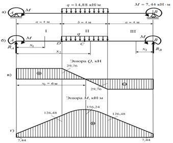 Так как на концах участка II поперечная сила меняет свой знак с плюса на минус, то на данном участке изгибающий момент принимает максимальное значение. Из условия