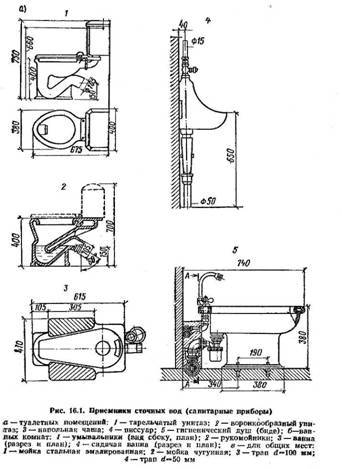Несомненный интерес представляют тарельчатого типа и сифонирующие консольные унитазы, подвешенные к стене на болтах. Задняя часть прибора имеет прилив (опору) с отверстиями для болтовых креплений к стене. Прибор занимает очень мало места, не загромождает пол, удобен в эксплуатации, особенно в общественных туалетах. В строительстве применяют напольные клозетные чаши с подставками для ног. Напольные клозетные чаши выполняют разных размеров и конструкций: укрепляют в полу, оборудуют приставными гидрозатворами (сифонами) диаметром 100 мм. Вода для смыва загрязнений подается из смывных бачков повышенной вместимости — до 10 л. Для улучшения промывки чаши от загрязнений устанавливают в качестве промывного устройства смывные краны и автоматические смывные бачки. Однако эти приборы плохо смывают загрязнения и создают антисанитарную обстановку в помещениях санузлов, где они установлены. Писсуары. В мужских туалетах устанавливают писсуары настенные, напольные (уриналы) и лотковые из фарфора, полуфарфора шириной 350—360 мм или фаянса. Настенные писсуары оборудованы приставным гидравлическим затвором (сифоном) и подводящими воду трубами диаметром 15 мм с водоразборным специальным краном вентильного типа. Настенные приборы укрепляют на высоте 0,60—0,65 м от уровня пола, в школах и детских садах — на высоте 0,4—0,5 м. Напольные писсуары (уриналы) из фаянса оборудованы нижней чашей с выпуском, покрытым решеткой, вертикальной стенкой с боковыми щитками. Ширина уриналов 450—500 мм, высота 950—1050 мм от пола, глубина чаши 400 мм. Для эффективной промывки одного уринала необходим расход воды около 0,2— 0,25 л/с. Писсуары лоткового типа устраивают с облицовкой керамической глазурованной плиткой или пластиком на высоту не менее 1500 мм от пола. Ширина лотка 300 мм, минимальная глубина 50 мм, уклон 0,015. Длину лотка принимают из расчета 0,6 м на человека. Лотковые писсуары оборудуют выпуском (в самой нижней точке) диаметром 40 мм с решеткой и устройством для промывки вертикальной стены и лотка. Воду для промывки подают непосредственно из водопровода или от автоматически действующего смывного бачка по перфорированной трубе диаметром 15 мм с удельным расходом воды 0,03 л/с на метр лотка. Биде — гигиенический индивидуальный душ — санитарный прибор, который устанавливают в помещениях личной гигиены женщин производственных и общественных зданий и в санитарных узлах жилых зданий. Биде имеют фаянсовую чашу высотой 370 мм, длиной 620 мм и шириной 430 мм, оборудованную устройством для подводки холодной и горячей воды, смешения в смесительной арматуре и подачи в душирующую сетку, обеспечивающую направление струй воды снизу вверх. Вода может быть направлена в боковые каналы для обогрева бортов прибора. Выпуск стоков диаметром 40 мм оборудован гидравлическим затвором (сифоном) с защитной решеткой от засоров. Удельные расходы холодной и горячей воды составляют по 0,05 л/с.