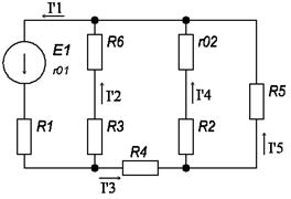 Знак "-" говорит о том, что ток течет в обратном направлении которого мы задались в пункте а). 4) Составить баланс мощностей для заданной схемы. Источник E1 и E2 вырабатывают электрическую энергию, т.к. направление ЭДС и тока в ветвях с источниками совпадают. Баланс мощностей для заданной цепи пишется так: E1I1+E2I4=I12(R1+r01)+I22(R3+R6)+I32R4+I42(R2+r02)+I52R5. Подставляем числовые значения и вычисляем: 20ּ0,332+30ּ0,489=0,3322ּ65+0,0312ּ45+0,2992ּ25+0,4892ּ45+0,172ּ52 21,31Вт=21,706Вт С учетом погрешностей баланс мощностей получился. 5) Результаты расчетов токов по пунктам 2 и 3 представить в виде таблицы и сравнить.