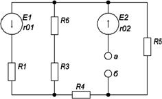 Зная Ixx величины сопротивлений и ЭДС, в схеме можно определить Uxx как разность потенциалов между клеммами а и б. Для этого потенциал точки а будем считать известным и вычислим потенциал точки б. φб=φа+E2-IxxּR5 тогда Uxx=φб-φа=E2-IxxּR5=30-0,141ּ52=22,668В Для расчета внутреннего сопротивления эквивалентного генератора необходимо преобразовать активный двухполюсник в пассивный (рис. 1.6), при этом ЭДС Е1 и E2 из схемы исключается, а внутренние сопротивления этих источников r01 и r02 в схеме остаются. Вычисляем эквивалентное сопротивление схемы (рис 1.6) относительно зажимов а и б: