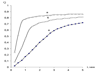 Рис. 1. Зависимость степени осветления (Q) от времени (t) в присутствии флокулянтов с концентрацией 0,75 мг/дм3, доза извести 3,81 мг-экв/дм3, доза коагулянта 0,5 мг-экв/дм3. а – отсутствие флокулянта, б – флокулянт Праестол 650ВС, в – флокулянт Праестол 2530 На рис.1 приведены типичные кинетические кривые седиментации шлама в отсутствие и присутствии флокулянтов в концентрации 0,75 мг/дм3. Аналогичные зависимости получены и для концентраций ПАА 0.5 и 1.0 мг/дм3. Из приведенных данных видно, что введение в исследуемую систему флокулянта значительно увеличивает скорость осаждения шлама и ускоряет процесс осветления воды в процессе коагуляции, причем эффективность действия флокулянта анионного типа выше, чем катионного. Более наглядно флокулирующий эффект можно оценить введя безразмерный параметр D = (V – V0)/V0 , где V и V0 – скорости седиментации дисперсной фазы в присутствии и отсутствии флокулянта, соответственно [4]. Для большей определенности оценки D значения V и V0 были взяты нами для фиксированной степени осветления цилиндров Q = 0.5. Полученные данные, приведенные в табл. 2, показывают значительно более высокую эффективность анионного флокулянта Праестол 2530. Таблица 2. Зависимость флокулирующего эффекта D0.5 от типа и концентрации флокулянта.