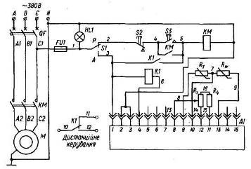 Рис.22. Схема керування припливно-витяжною установкою ПВУ-4М Сигнал термоперетворювача порівнюється з системою за-датчика температури і формується сигнал непогодження. На виході регулятор формує імпульси, які чергуються з паузами відповідно до величини сигналу непогодження. Імпульси через реле К\ і К2 керують роботою виконавчого механізму М4. Виконавчий механізм відкриває або закриває регулюючі заслінки, змінюючи частку зворотної теплоти, що подається в приміщення. Якщо при досягненні регулюючими заслінками положення "Норма рециркуляції" (коли спрацює кінцевий вимикач 5ф2) температура в приміщенні залишається нижчою від заданої, то реле ІСЗ відповідно до команд регулятора А1 починає відкривати тиристори У81 - У8А і через них подавати напругу на нагрівні елементи ЕК1 - ЕКЗ. Якщо і після цього температура в приміщенні продовжує знижуватись і досягне гранично допустимого значення, встановленого на регуляторі А1, увімкнеться реле Я4 і через виконавчий механізм М4 встановить регулюючі заслінки в положення "100 рециркуляція". При цьому все тепле повітря буде повертатися в приміщення. Коли температура в приміщенні буде підвищуватись, починає діяти зворотний алгоритм регулювання. Захист електродвигунів вентиляторів від аварійних режимів здійснюється фазочутливими пристроями захисту Р1, Р2, РЗ. Нагрівні елементи від струмів короткого замикання захищені автоматичними вимикачами С) Р1 - С^РЗ, а тиристори - плавкими запобіжниками РЇЛ, РІІ2. Апарати керування та захисту установки ПВУ-4М змонтовані в шафі керування, при цьому одна шафа обслуговує три установки. Одна установка ПВУ-4М забезпечує подачу повітря в приміщення на припливі - 5 тис. м3/год, на відпливі - 4,5 тис. м3/год. Встановлена потужність електронагрівників дорівнює 15 кВт. Осьовий вентилятор приводиться від електродвигуна потужністю 1,1 кВт, механізм привода заслінок - від мотор-редуктора з двигуном потужністю 0,55 кВт. Особливості автоматизованого електропривода вентиляційних установок в інших технологічних процесахВентиляційні установки з електроприводом широко застосовуються в багатьох технологічних процесах сільськогосподарського виробництва. Використовують їх для сушіння та активного вентилювання зерна, малосипучих матеріалів, в овоче- та фруктосховищах, спорудах захищеного ґрунту. Основною відмінністю цих установок є специфічні вимоги до режиму роботи та керування, що зумовлює особливості в схемах керування та принципах автоматизації. Установка УВС-16А призначена для досушування сіна за допомогою вентилятора з електродвигуном потужністю 15 кВт. Схема керування установкою наведена на рис.23.