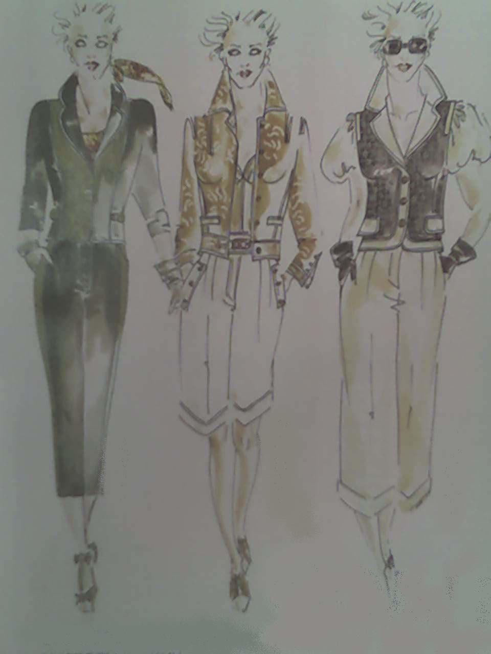Рис 2. Модель 3 Модель 1. Современный взгляд на 40-е годы. Элегантное пальто прямого силуэта, выполненное в стиле «редингот», но не в классическом прочтении. Рукава «баллоны» сложной конструкции с нарастанием объема на уровне локтя зрительно делают форму более стройной в уровне стана. Это ощущение дополняется туго стянутым широким поясом на талии. Линия плеча прямая, естественной ширины. Поддерживается верхней плечевой накладкой формы «реглан» слегка седловидного очертания, что придает легкость плечевому поясу. Плечевая накладка выдвинута в сторону рукава на 2,0 см. Для создания вертикальной линии проймы длина плечевого шва сокращена. Конструктивно форма силуэта достигнута за счет минимального количества формообразующих линей: среднего шва спинки, бокового шва и рельефа на полочке, выходящего из нижнего угла проймы и на уровне бедер переходящего в вытачку. При небольшом объеме изделия форма в области груди немного уплощена, для этого большая часть нагрудной вытачки была распределена в линию рельефа, значительно смещенного относительно центра груди, а оставшаяся часть переведена в линию проймы, после чего плечевой шов был перемещен в сторону полочки. Для придания большей стройности форме все конструктивные срезы оформлены плавными линиями со слегка завышенным, скользящим участком прилегания и с сохранением объема на уровне бедер. Рукава втачные приближенные к рубашечному, не традиционной конструкции. Отрезная линия, расположенная на уровне локтя, позволяет получить ромбовидную форму с наполнением с внешней стороны рукава за счет конического развода. Окат рукава слегка наполнен и возвышается над плечом. Конструктивно это достигается увеличенной посадкой по окату рукава, технологически – шов втачивания направляется в рукав. Низ рукава слегка припосажен на отложной притачной манжете. Застежка с расходящимися рядами пуговиц обуславливает положение борта (он скошен), как ретро прием «работающей» на стройность формы. Воротник отложной умеренной ширины на невысокой стойке с острыми концами. Карманы прорезные с листочкой слегка наклонные, расположены высоко. В среднем шве спинки короткая шлица. Талия подчеркнута широким жестким поясом на пряжке из основной ткани или кожаным. Длина до середины колена или за колено. Модель 2 Современный городской комплект «Маленький» компактный жакет смягченных очертаний благодаря покрою. Его носят с платьями мини, короткими брючками, юбками формы «тюльпан» и др. чаще всего встречается сочетание с маленькой прямой юбкой. Из материалов, в которых должен чувствоваться налет спортивности (покрытие, с пропиткой). Это придает комплекту спортивность, молодежный вид. Оформление швов и рельефов тесьмой или кантом подчеркивает архитектурность конструкции, восходящую к эпохе Куррежа. Жакет полуприлегающего силуэта с цельновыкроенными рукавами. Перераспределение прибавки на свободу облегания по груди в пользу спинки обеспечивает комфортность изделия. Линия плеча наклонная, естественной ширины, поддерживается верхней плечевой накладкой промежуточной формы. Конструктивно форма решена за счет вертикальных рельефов «бретель» на спинке и полочке, расположенных традиционно, и бокового шва. Прилегание протяженное скользящее. Рукав цельнокроеный с ластовицей, приближен к отвесному положе
