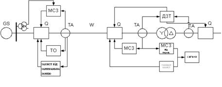 Витримка часу другої ступіні вибирається за умовою відбудування від різночасності вимикання фаз вимикача і складає 0,1-0,2 с. 6 Опис взаємодії захистів При міжфазному к.з. у лінії спрацьовує І ступінь східчастого струмового захисту лінії - струмове відсічення без витримки часу і відключає вимикач Q1. При відмовленні струмового відсічення з витримкою часу 2,5 секунди спрацьовує третя ступінь - максимальний струмовий захист лінії і також на відключення вимикача Q1. Найбільш розповсюдженим видом к.з. у лініях є однофазне к.з. Воно складає 83 % від усіх нидів к.з. у мережах. При виникненні такого ушкодження спрацьовує спочатку перша ступінь східчастого струмового захисту лінії нульової послідовності - токове відсічення нульової послідовності, а у випадку її відмовлення спрацьовує друга ступінь - максимальним струмовий захист нульової послідовності. Витримка часу другої ступіні складає 0,1-0,2 сек. Найбільш ймовірним видом ушкодження в трансформаторі є виткові замикання в одній фазі. При малому числі витків, що замкнулися, струм в ушкодженій фазі з боку живлення може виявитися менше Iном, а напруга на виводах не зміниться. При цьому без витримки часу на відключення вимикачів Q2 і Q3 повинен спрацювати газовий захист трансформатора. При відмовленні газового захисту кількість витків, що замкнулися, збільшиться спрацює диференціальний токовий захист трансформатора і без витримки часу відключить вимикачі Q2 і Q3. Перераховані вище захисти трансформаторів резервує МСЗ трансформатора і МСЗ лінії. При відмовленні ДЗТ повинна спрацювати І ступінь східчастого струмового захисту лінії на відключення вимикача Q1 чи з витримкою часу 21,0 сек. МСЗ трансформатора на відключення вимикачів Q2 і Q3. В останньому випадку МСЗ лінії повернеться у вихідне положення за рахунок більшої витримки часу. При к.з. на шинах 6 кВ, що не мають спеціального захисту, приходить у дію МСЗ трансформатора і відключає вимикач Q3. При к.з. на приєднаннях, що відходять, струм к.з. проходить по всіх ділянках мережі, розташованим між джерелом живлення і місцем к.з. При цьому опрацьовує МСЗ лінії, МСЗ трансформатора і МСЗ на приєднанні, що відходить. При нормальній роботі захистів за умовою селективності повинний відключитися вимикач на ушкодженому приєднанні. Інші захисти повернуться в початкове положення. Резервування МСЗ приєднання виконують МСЗ трансформатора і МСЗ лінії. У результаті роботи спроектовано захист блоку лінія – трансформатор. Розраховані уставки реле струму та напруги, які використовуються у захистах. Отже, для лінії приймається двоступінчатий струмовий захист. До трансформатору розраховано диференційний захист, захист від перевантаження, газовий захист. У ролі резервної використовується МСЗ трансформатора з комбінованим пуском по напрузі. Використання МСЗ отримало поширене значення із-за техніко-економічних обставин. Цей захист має простий, надійний та невеликий за вартістю вид. При розрахунку захисту використовувався принцип селективності. Для цього приймалась ступінь селективності Дt=0,5 с. Увесь захист було перевірено на чутливість. При цьому коефіцієнт чутливості для захисту є більше найбільш доступного Кi≥1,5. Були обрані наступні типи захистів: – диференціальний захист трансформатора, виконаний на реле ДЗТ– 11. Струм спрацьовування на основній сторо