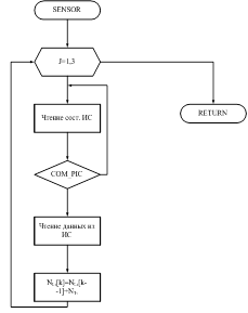 Рисунок 6.3 - Блок-схема процедуры обслуживания датчиков Для приема информации о перемещении по трем координатам организован цикл, начинающийся с анализа состояния ИС. Как было сказано выше, единичное значение разряда СОМ_Р1С разрешает чтение кода перемещения в ЦЭВМ. Процедура SPEED выполняет вычисление значения скорости вращения двигателя методом числового дифференцирования. Блок-схема процедуры определения скорости вращения вала двигателя приведена на рисунке 6.4.