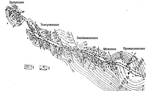 Рис. 1 Структурная карта Цубукско-Промысловской зоны месторождений. 1- изогипсы в м. 2 – тектонические нарушения.