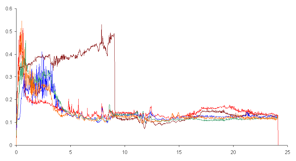 Рис. Х. Диаграмма испытания масла И-20А в режиме изменения нагрузки При испытании в режиме изменении частоты (рис. Х) при выходе на частоту более 235 Гц происходит снижение амплитуды, где при 500 Гц частота становиться равной 0, что свидетельствует об образования схватывания и неспособности масла И-20А выдержать такие частоты. Поэтому было принято решение снизить верхний предел частоты до 227 Гц с учетом постоянного градиента изменения. Испытания в режиме изменения температуры планировалось