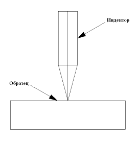 Рис. 1. Схема точечного контакта Стальной шарик и образец зафиксирован в определенном положении при помощи специальных держателей: верхнего и нижнего. С помощью верхнего держателя образцу передается заданная нагрузка и осуществляется перемещение шарика при помощи стержня передачи (См. рис. 2).