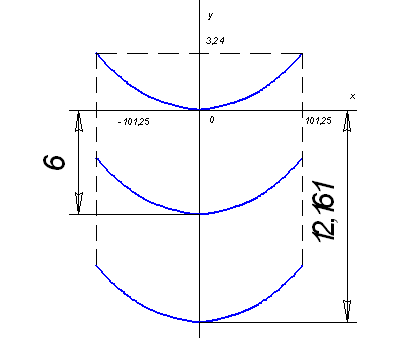 Кривая 2, называемая габаритной, сдвинута о вертикали вниз от кривой 1 на расстояние требуемого габарита от земли Г=6 м. Кривая 3 – земляная – сдвинута от кривой 1 вниз на расстояние h2-λгир.ф=13,5-1,339=12,161 м (рисунок 6.1).