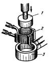 Рис.2.1 Поверхневе гартування з нагрівом струмами високої частоти: 2 - гартована деталь; 2 - індуктор; 3 - охолоджувач Форма індуктора відповідає зовнішній формі виробу. Індуктор є мідними трубками з циркулюючою усередині водою для охолоджування. Швидкість нагріву залежить від кількості теплоти, що виділилася, пропорційної квадрату сили струму і опору металу. Щільність струму по перетину деталі нерівномірна, по поверхні вона значно вища, ніж в серцевині. Основна кількість теплоти виділяється в тонкому поверхневому шарі. Глибина проникнення струму в метал залежить від властивостей металу, що нагрівається, і назад пропорційна квадратному кореню з частоти струму. Чим більше частота струму, тим тонше виходить загартований шар. Зазвичай застосовують машинні генератори з частотою 500-15000 Гц і лампові генератори з частотою до 106 Гц. При використанні машинних генераторів товщина загартованого шару складає 2-10 мм, лампових, - від десятих доль міліметра до 2 мм. Після нагріву в індукторі деталь охолоджують за допомогою спеціального пристрою, що охолоджує. Через наявні в нім отвори на поверхню деталі розбризкується рідина, що охолоджує. Структура загартованого шару складається з мартенсіту, а перехідної зони - з мартенсіту і фериту. Глибинні шари нагріваються до температур нижче критичних і при охолоджуванні не зміцнюються. Для підвищення міцності серцевини перед поверхневим гартом деталь інколи піддають нормалізації або поліпшенню. Нагрів триває зазвичай до 10 С, причому швидкість нагріву складає 100-1000 °С/с. Перевагами поверхневого гарту ТВЧ є регульована глибина загартованого шару; висока продуктивність і можливість автоматизації; відсутність зневуглецювання і окалиноутворення, мінімальне викривлення деталі. До недоліків відносяться висока вартість індуктора (індивідуального для кожної деталі) і, отже, мала застосовність ТВЧ до умов одиничного виробництва. Для поверхневого гарту застосовують зазвичай вуглецеві стали, такі, що містять близько 0,4 % С. Глибока прожарюванність при цьому методі не використовується, тому леговані сталі зазвичай не застосовують. Після гартування проводять низьку відпустку при 200°С або навіть самовідпуск. Після гартування і відпустки твердість сталі 45-55 HRC на поверхні і 25-30 HRC в серцевині. Високочастотному гартуванню піддають шийки колінчастих валів, кулачкових валів, гільзи циліндрів, поршневі пальці, деталі гусениць, пальці ресори і так далі. Вибір товщини зміцнюваного шару залежить від умов роботи деталі. Якщо від деталі вимагається лише висока зносостійкість, товщина зміцнюваного шару складає 1,5-3 мм, в разі високих контактних навантажень і можливого перешліфовування оптимальна товщина зростає до 5-10 мм. Для поверхневого гартування може використовуватися нагрів лазером. Це дозволяє уникнути необхідності виготовлення індивідуальних індукторів. Лазери - це квантові генератори оптичного діапазону, в основу роботи яких покладено посилення електромагнітних коливань за рахунок індукційного випромінювання атомів (молекул). Лазерне випромінювання поширюється дуже вузьким пучком і характеризується високою концентрацією енергії. Джерелами випромінювання, що генерується, служать тверді тіла (рубіни, алюмінієві граніти, ітрій, стекла) і гази (Не, Ne, Аr, СО2). Під дією лазерного випромінювання поверхня д
