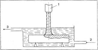 Рис.3.1 Схема будови ЗТД при плазмовому зміцненні Зона оплавлення 1 (перший шар) має місце при гартуванні з оплавленням. Як правило, зона оплавлення має стовпчасту будову з кристалами, витягнутими у напрямі тепловідводу. Основна структурна складова - мартенсіт, карбіди зазвичай розчиняються. При оптимальних режимах гартування з розплавленням зневуглецювання не відбувається, немає пір і шлакових включень. При плазмовому гартуванню без оплавлення перший шар відсутній. Другий шар - зона гартування 2 з твердої фази. Його нижній кордон визначається температурою нагріву до Ас1. В цьому випадку разом з повним гартом відбувається і неповна. По глибині даний шар характеризується структурною неоднорідністю. Ближче до поверхні є мартенсіт і залишковий аустеніт, отримані при охолоджуванні з гомогенного аустеніту. Ближче до вихідного металу разом з мартенсітом є елементи вихідної структури: феріт в доевтектоїдній сталі і цементит в заевтектоїдній. У перехідній зоні 3 (третій шар) метал нагрівається нижче за точку Ас1. Якщо сталь має вихідний стан після гартування або відпуску, то в результаті плазмової обробки в цьому шарі утворюються структури відпуску - троостіт або сорбіт, що характеризуються зниженою твердістю. Зона термічного впливу плазмового струменя (дуги) має форму сегменту, по своїй будові вона аналогічна ЗТД електронного і лазерного променів. При плазмовому нагріві не завжди удається уникнути накопичення теплоти в оброблюваному виробі. З метою усунення накопичення теплоти у виробі використовують плазмове зміцнення в рідких середовищах. Оброблюваний виріб занурюють в рідину так, щоб над його поверхнею був рідкий прошарок певної товщини (рис.3.2).