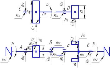 Учитывая, что геометрические параметры быстроходной ступени незначительно отличаются от тихоходной, выполнение проверочных расчетов нецелесообразно. 5. Проектный расчет валов редуктораПо кинематической схеме привода составляем схему усилий, действующих на валы редуктора по закону равенства действия и противодействия. Для этого мысленно расцепим шестерни и колеса редуктора, при этом дублирующий вал не учитываем. Схема усилий приведена на рис.1.