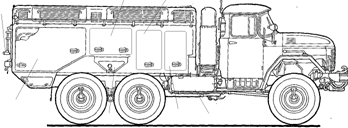 В отсеках с правой стороны кузова размещены: 1. панель управления заправкой; 2. панель кольцевания; 3. панель выводов гидросистемы; 4. панель агрегатов нагнетания с выводами напорных магистралей и нагнетательными шлангами; 5. гидробак; 6. электрокабели, 7. силовой блок электрооборудования; 8. аккумуляторная батарея; 9. технический отдел; 10. габаритные огни; 11. бензобак. Кузов металлический, специальный, в отсеках и нишах которого смонтировано оборудование установки УПГ-300. Состоит кузов из трех основных частей: нижней части (несущей рамы), верхней части (съемного кожуха) и подвесных отсеков. Каждая часть состоит из стального каркаса и металлической обшивки, приваренной к каркасу точечной сваркой. Верхняя часть крепится к нижней болтами. Дня удобства подхода к оборудованию в кузове со всех сторон предусмотрены эксплуатационные люки. По левой стороне кузова в специальных отсеках размещены: приборные панели управления электрооборудованием и силовой установкой; приборные доски гидросистемы, системы ручного насоса и пневмосистемы; монтажная панель агрегатов линии всасывания гидросистемы с выводами всасывающих магистралей; панель выводов пневмосистемы; аккумуляторная батарея, ЗШ. В отсеках правой стороны кузова размещены: панель управления заправкой, панель кольцевания; панель выходов гидросистемы; панель агрегатов нагнетания с выводами напорных магистралей и нагнетательными шлангами; гидробак; электрокабели, силовой блок электрооборудования; аккумуляторная батарея. В отсеках задней части кузова размещены: баллоны пневмосистемы; ручка управления кранами блока радиатора; щиток выводов для подключения переговорного устройства и кабеля постоянного тока; клемная колодка; блок радиаторов гидросистемы; топливный бак силовой установки. В центральной части кузова (силовой отсек) размещена силовая установка. Силовая установка УПГ-300 (рис. 2) предназначена для привода генератора ГCP-CT-I2000 ВТ, трех гидронасосов НП-52М, осевого вентилятора блока радиаторов гидросистемы и маслонасоса раздаточной коробки.