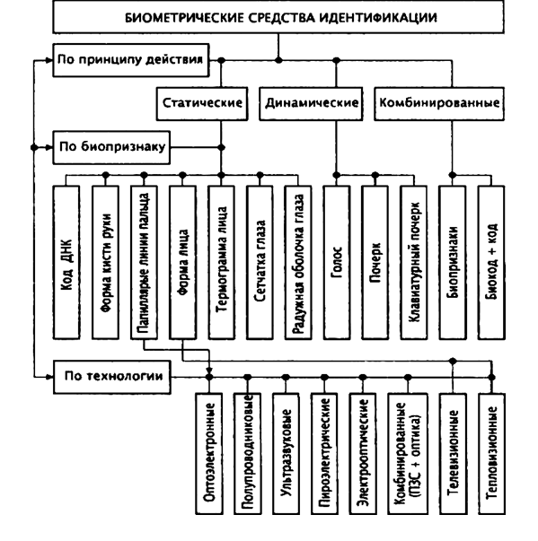| Курсовая работа: Биометрические средства идентификации личностиКурсовая работа: Биометрические средства идентификации личностиСОДЕРЖАНИЕ Введение 1.Классификация и основные характеристики биометрических средств идентификации личности 2. Особенности реализации статических методов биометрического контроля 2.1 Идентификация по рисунку папиллярных линий 2.2 Идентификация по радужной оболочке глаз 2.3 Идентификация по капиллярам сетчатки глаз 2.4 Идентификация по геометрии и тепловому изображению лица 2.5 Идентификация но геометрии кисти руки 3. Особенности реализации динамических методов биометрического контроля 3.1 Идентификация по почерку и динамике подписи 3.2 Идентификация но голосу и особенностям речи 3.3 Идентификация по ритму работы на клавиатуре 4. Биометрические технологии будущего Заключение Литература Введение Тема курсовой работы «Биометрические средства иденфикации личности». Для идентификации личности современные электронные систем контроля и управления доступом (СКУД) используют устройства нескольких типов. Наиболее распространенными являются: - кодонаборные устройства ПИН-кода (кнопочные клавиатуры); - считыватели бесконтактных смарт-карт (интерфейс Виганда); - считыватели проксимити-карт; - считыватели ключа «тач-мемори»; - считыватели штрих-кодов; - биометрические считыватели. В настоящее время самое широкое распространение получили всевозможные считыватели карт (проксимити, Виганда, с магнитной полосой и т. п). Они имеют свои неоспоримые преимущества и удобства в использовании, однако при этом в автоматизированном пункте доступа контролируется «проход карточки, а не человека». В то же время карточка может быть потеряна или украдена злоумышленниками. Все это снижает возможность использования СКУД, основанных исключительно на считывателях карт, в приложениях с высокими требованиями к уровню безопасности. Несравненно более высокий уровень безопасности обеспечивают всевозможные биометрические устройства контроля доступа, использующие в качестве идентифицирующего признака биометрические параметры человека (отпечаток пальца, геометрия руки, рисунок сетчатки глаза и т. п.), которые однозначно предоставляют доступ только определенному человеку - носителю кода (биометрических параметров). Но на сегодняшний день подобные устройства все еще остаются достаточно дорогими и сложными, и поэтому находят свое применение только в особо важных пунктах доступа. Считыватели штрих-кодов в настоящее время практически не устанавливаются, поскольку подделать пропуск чрезвычайно просто на принтере или на копировальном аппарате. Цель работы рассмотреть принципы работы и использования биометрических средств иденфикации личности. 1. Классификация и основные характеристики биометрических средств идентификации личности Достоинства биометрических идентификаторов на основе уникальных биологических, физиологических особенностей человека, однозначно удостоверяющих личность, привели к интенсивному развитию соответствующих средств. В биометрических идентификаторах используются статические методы, основанные на физиологических характеристиках человека, т. е. на уникальных характеристиках, данных ему от рождения (рисунки папиллярных линий пальцев, радужной оболочки глаз, капилляров сетчатки глаз, теп