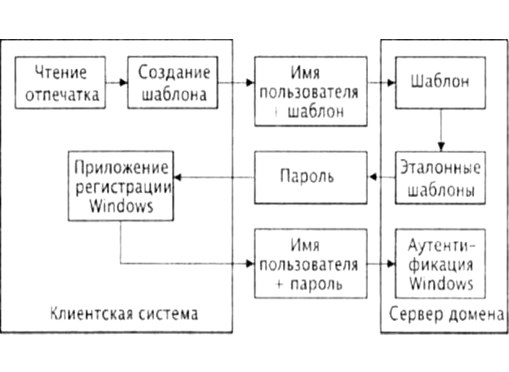 Рис. 3. Процесс аутентификации по отпечаткам пальцев Распознавание отпечатка пальца основано на анализе распределения особых точек (концевых точек и точек разветвления папиллярных линий), местоположение которых задается в декартовой системе координат. Для снятия отпечатков в режиме реального времени применяются специальные контактные датчики различных типов. Системы идентификации по отпечаткам пальцев выпускаются в течение почти трех десятков лет Однако благодаря достигнутым успехам в области машинного распознавания отпечатков только в последние годы заметно увеличилось число фирм, выпускающих терминалы персональной аутентификации на базе дактилоскопии. Американская фирма Fingermatrix предложила терминал Ridge Reader, который благодаря процедуре компенсации различных отклонений, возникающих при снятии отпечатка пальца в реальных условиях, а также применяемому способу «очищения» изображения и восстановления папилярного узора (который может быть «затуманен» из-за наличия на пальце грязи, масла или пота) допускает коэффициент ошибок 1-го рода не более 0,1 %, 2-го рода - не более 0,0001 %. Время обработки изображения составляет 5 с, регистрации пользователя составляет 2-3 мин. Для хранения одного цифрового образа отпечатка (эталона) расходуется 256 байт памяти. Компания De La Rue Printrak Inc. производит систему PIV-100 на базе терминала аутентификации по отпечаткам пальцев. Кроме этих терминалов, в состав аппаратуры входят центральный процессор, контрольный пульт, дисплей, принтер, накопители на винчестерских дисках (для хранения базы данных), накопители на гибких дисках (для резервной памяти). В этой системе требуемые коэффициенты ошибок могут выбираться в зависимости от необходимого уровня обеспечения безопасности путем под-стройки внутренних зависимых системных параметров, таких как пороговые значения принятия решения, сопоставляемые характеристики, стратегия распознавания. Но за возросшую точность приходится расплачиваться уменьшением быстродействия и снижением удобств для пользователей. Автоматическая обработка полученного дактилоскопического изображения начинается с преобразования первичного образа с разрешением 512 х 512 точек изображения и плотностью 8 бит на точку к конечному набору (множеству), состоящему примерно из 100 особых точек папиллярного узора, каждая из которых занимает 3 байт памяти. В результате объем памяти для хранения одного отпечатка по сравнению с первоначальным изображением уменьшается примерно в 1000 раз. Сопоставление двух дактилоскопических образов - оригинального и эталонного, хранящегося в памяти системы, - производится с помощью некоторой корреляционной процедуры. Время регистрации пользователя в базе данных - меньше 2 мин; вся процедура проверки пользователя занимает около 10 с, из которых 2 с уходит на аутентификацию, т. е. на вычисления по сопоставлению отпечатков. Говоря о надежности аутентификационной процедуры по отпечаткам пальцев, необходимо рассмотреть также вопрос о возможности их копирования и использования другими лицами для получения несанкционированного доступа. В качестве одной из возможностей по обману терминала специалисты называют изготовление искусственной кисти с требуемыми отпечатками пальцев (или изъятия «подлинника» у законного владельца). Но существует и способ борьбы с 