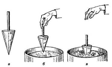 Рис. 3.12. Інструменти для опорядження штукатурки борознами і штрихами: а - гофрований шаблон з листового металу б - валик-шаблон з дерева; в - валик-шаблон, обтягнутий сіткою 4. Штукатурні розчини та їхні властивості Штукатурні розчини бувають прості і складні. Якщо у складі розчину присутній один в'яжучий матеріал, розчин називають простим (вапняковий, цементний, гіпсовий тощо), два і більше в'яжучих - складним (цементно-вапняний, вапняно-гіпсовий тощо). Розчин повинен бути пластичним, мати потрібну рухомість і водоутримувальну здатність. Пластичним називають розчин, який легко розрівнюється на поверхні штукатурним інструментом, не утворюючи тріщин. Пластичний розчин добре прилипає до поверхні і зчеплюється з нею. Пластичність залежить від співвідношення в розчині в'яжучого матеріалу і заповнювача. У пластичних розчинах міститься 25-35 % в'яжучого матеріалу, для економи якого в розчин додають пластифікатори: глину, пластифікатор БС тощо. Розчин з недостатньою кількістю в'яжучого матеріалу називають пісним, а з надмірною - жирним. Аби визначити пластичність (жирність) розчину, його досить пригладити штукатурною лопаткою. Якщо смуга від лопатки утворюється гладенькою, без тріщин, то розчин пластичний. З цією ж метою можна занурити у розчин і витягнути дерев'яну рейку або держак лопати. Якщо розчин прилипне до дерева, то він пластичний, має достатню жирність. Рухомість розчину залежить від кількості води в ньому: чим більше води, тим він рухоміший, і навпаки. Його вимірюють за допомогою стандартного металевого конуса масою 300 г, який має поділки від 1 до 15 см (рис. 4.1, а). Для визначення рухомості конус встановлюють так, щоб його вершина дотикалась до поверхні розчину (рис. 4.1, б), і відпускають. На скільки сантиметрів конус занурився у розчин, така й буде його рухомість (рис. 4.2, в). Рухомість розчинів для штукатурних робіт повинна бути: для першого підготовчого шару (оббризку) - 10-12 см; для другого підготовчого шару (ґрунту) - 7-9 см; для опоряджувального шару (накривки) - 10-12 см. Властивість розчину утримувати в собі воду під час зберігання, транспортування і нанесення на пористу поверхню називається водоутримувальною здатністю. Високу водоутримувальну здатність мають пластичні розчини. За міцністю штукатурні розчини поділяють на такі марки: 25,50,75,100. Для звичайних штукатурних робіт застосовують цементні, цементно-вапняні, вапняні, вапняно-гіпсові, а для декоративних -вапняно-піщані, теразитові і каменеподібні розчини. Склад розчину записують цифровим співвідношенням його масових або об'ємних (здебільшого) частин, наприклад: цементний розчин 1:3. Це означає, що для приготування такого розчину слід брати за об'ємом одну частину цементу і три частини піску (простий розчин). Для приготування цементно-вапняного розчину 1:1:5 треба брати одну частину цементу, одну частину вапняного тіста і п'ять частин піску (складний розчин).