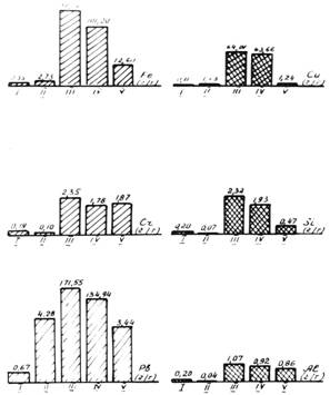 Аналіз даних табл.3 показує, що процес фільтрація очищеного масла дозволяє знизити зміст механічних домішок в 6,5 рази в порівнянні з очищенням відцентровими апаратами й в 2,5 рази поліпшити світлопроникність. Зміст миючих присадок у фільтраті знизилося на 3% у порівнянні з очищеним маслом і на 12% у порівнянні з відпрацьованим. Зміст механічних домішок у товарному маслі майже в 10 разів перевищує припустимі, значення, в'язкість на 2% нижче стандарту. Фільтрат містить в 2 рази менше механічних домішок і на 10% знижена в'язкість за рахунок деструкції полімерів у процесі експлуатації у двигуні. У цілому показники фільтрату наближаються до відповідних вимог стандарту, а при уведенні в нього композиції присадок буде відповідати стандарту. По даних видах масел був зроблений спектральний аналіз результати якого представлені на гістограммах (мал.6). По змісту забруднень і продуктів зношування двигуна (Fe; Al; Cr; Cu; Si) фільтрат зіставимо з товарним маслом і в багато разів піку, чим в очищеному маслі. Результати порівняльного аналізу дозволяють затверджувати про значну ефективність процесу мікрофільтрації масла керамічними фільтрами й можливості доведення відпрацьованих масел до рівня свіжих товарних. Результати спектрального аналізу масла М10М2.