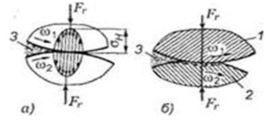 Рис. 6. Усилия и напряжения в контакте цилиндрических колес: 1— ведущее колесо; 2 — ведомое колесо; 3 — смазочное масло Наибольшие контактные напряжения определяют по формуле Герца: