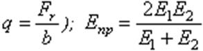 где q — нормальная нагрузка на единицу длины контактных линий (для цилиндрических катков - приведенный модуль упругости; Е1 и Е2 — модули упругости материалов ведущего и ведомого катков; -