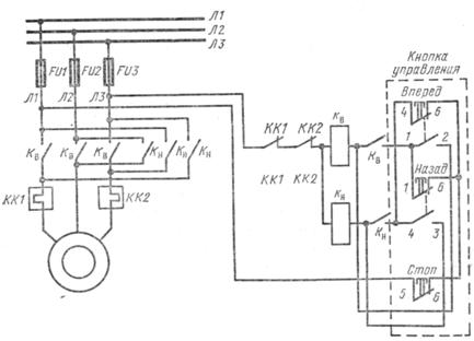 Схема включения реверсивного пускателя приведена на рис. 4.3. Кнопка управления «Вперед» имеет замыкающие контакты 1-2 и размыкающие контакты 4-6. Аналогичные контакты имеет кнопка пуска двигателя в обратном направлении («Назад»).