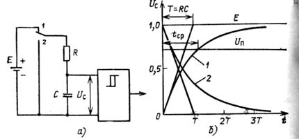Рис. 15.9. Полупроводниковое реле времени: в — принципиальная схема; б — процессы заряда / и разряда 2 конденсатора С целью