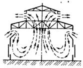 Аэрацией называется организованная естественная общеобменная вентиляция помещений в результате поступления и удаления воздуха через открывающиеся фрамуги окон и фонарей. Воздухообмен в помещении регулируют различной степенью открывания фрамуг (в зависимости от температуры наружного воздуха, скорости и направления ветра). Как способ вентиляции аэрация нашла широкое применение в промышленных зданиях, характеризующихся технологическими процессами с большими тепловыделениями (прокатных цехах, литейных, кузнечных). Поступление наружного воздуха в цех в холодный период года организуют так, чтобы холодный воздух не попадал в рабочую зону. Для этого наружный воздух подают в помещение через проемы, расположенные не ниже 4,5 м от пола (рис.1.8), в теплый период года приток наружного воздуха ориентируют через нижний ярус оконных проемов (А = 1,5...2 м). При расчете аэрации определяют требуемую площадь проходного сечения проемов и аэрационных фонарей для подачи и удаления необходимого количества воздуха. Исходными данными являются конструктивные размеры помещений, проемов и фонарей, величины теплопродукции в помещении, параметры наружного воздуха. Согласно СНиП 2.04.05–91 расчет рекомендуется выполнять на действие гравитационного давления. Ветровой напор надлежит учитывать только при решении вопросов защиты вентиляционных проемов от задувания. При расчете аэрации составляют материальный (по воздуху) и тепловой баланс помещения: