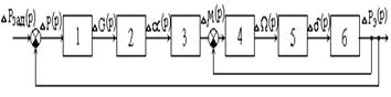 1- регулятор мощности; 2 - серводвигатель; 3 - гидравлическая турбина; 4 - звено, моделирующее изменение частоты вращения эквивалентного гидроагрегата от изменения момента; 5 - звено, моделирующее изменение угла Dd от изменения частоты вращения DW; 6 - звено, моделирующее изменение электрической мощности эквивалентного гидрогенератора от изменения угла Dd; Рзад - задание по мощности, (о.е.); Рэ - электрическая мощность эквивалентного гидрогенератора, (о.е.); G - регулирующее воздействие на входе серводвигателя, (о.е.); a - степень открытия направляющего аппарата, (о.е.); m - момент на валу турбины, (о.е.); W - угловая частота вращения, (о.е.); d - угол между векторами ЭДС эквивалентного гидрогенератора ГЭС и эквивалентного генератора приемной энергетической системы. 2.2. Передаточные функции элементов структурной схемы DG(p) Da(р) К’p + 1 W1(р) =-------- = Кр ; DР = DРзад - DРэ; W2(р) =-------- = ---------------; DP(р) DG(p) Трр Dm(p) 1 - a0Т0р DW(р) 1 W3(р) =----------- = ------------------- ; W 4(р) =--------------- = --------- ; Da(р) 1 + 0.5a0Т0р Dm(p) Тар Dd(р) 1 DРэ W 5(р) = ----------- = ----------- ; W 6(р) = ----------- = К х + К ‘х P, DW(p) Тdр Dd(р) где Кр - коэффициент передачи регулятора мощности; К’ - коэффициент передачи по скорости изменения мощности; Тр - постоянная времени регулятора, (с); a0 - исходная нагрузка эквивалентного гидроагрегата, (о.е.); Т0 - постоянная времени водовода при номинальной частоте вращения, соответствующая номинальной нагрузке агрегата, (с); Та - постоянная инерции эквивалентного гидроагрегата, отнесенная к базисной (номинальной) мощности, (с); Тd = 0.00318 с (при wном = 314 рад/с); К х , К ‘х - коэффициенты передачи эквивалентного гидроагрегата. 2.3. Параметры элементов структурной схемы