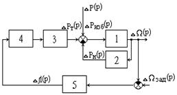 1-турбогенератор; 2 - звено, моделирующее регулирующий эффект электрической нагрузки; 3 - паровая турбина; 4 - гидравлический серводвигатель; 5 - регулятор частоты вращения; W - угловая частота вращения, (о.е.); Р - потребляемая электрическая мощность (нагрузки), (о.е.); Рт - механическая мощность на валу турбины, (о.е.); DРн - изменение мощности, обусловленное регулирующим эффектом нагрузки, (о.е.); Н - степень открытия регулирующего клапана турбины, (о.е.); l - регулирующее воздействие на выходе регулятора, (о.е.). 2.2. Передаточные функции элементов структурной схемы DW(p) 1 DРн(р) W1(р) =---------------- = ------- ; W2(р) =-------------- = К н ; DPизб(р) TJP DW(p) DРт(p) 1 DН(р) 1 W3(р) =------------- = --------------- ; W4(р) =--------------- = --------------- ; DН(р) Тп р + 1 Dl(p) Тд р + 1 Dl(р) W5(р) = -------------- = Кр (1 + К`р) , DW(p) где ТJ - постоянная времени механической инерции, (с); Кн - коэффициент регулирующего эффекта нагрузки; Тп - постоянная времени паропровода, (с); Кр, К’- коэффициенты передачи. 2.3. Параметры элементов структурной схемы